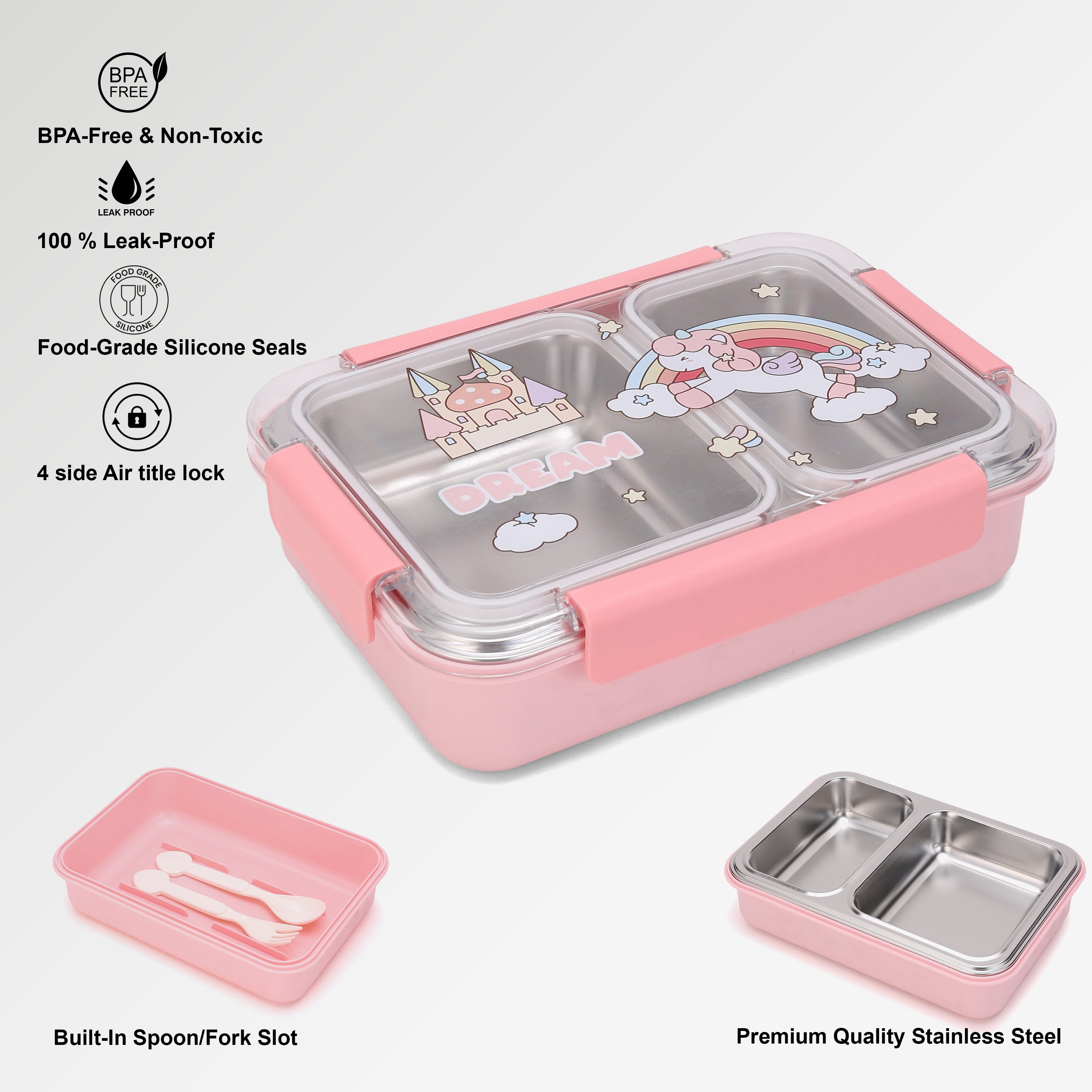 SNAP LOCK LID FOR SECURE SEAL: Our kids lunch box for school features a secure snap-lock lid that prevents spills—keeping bags clean and meals mess-free.