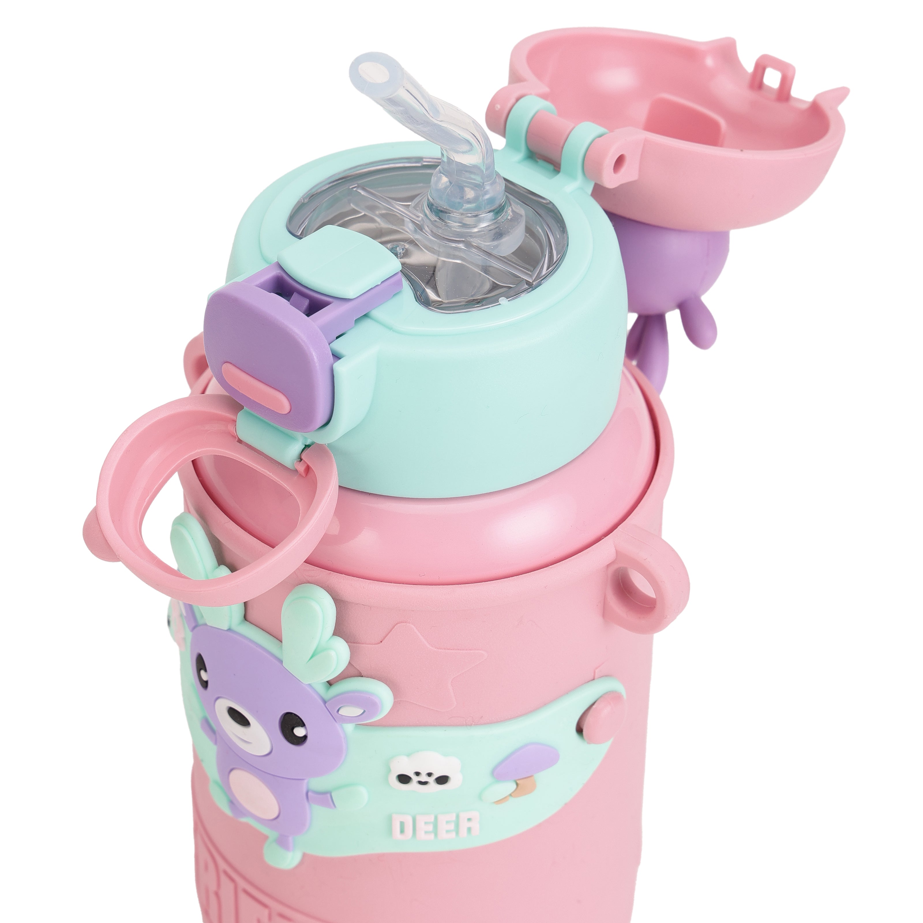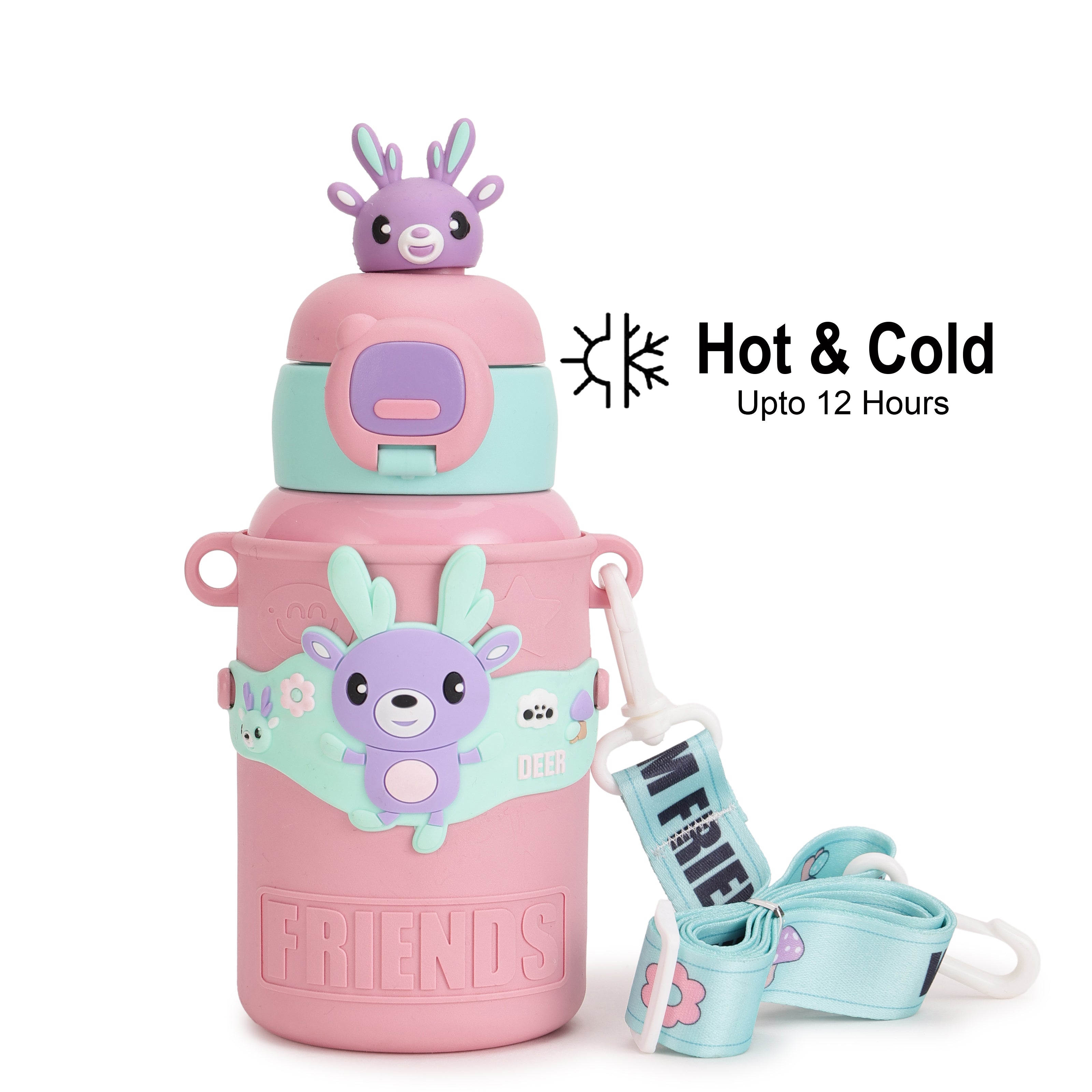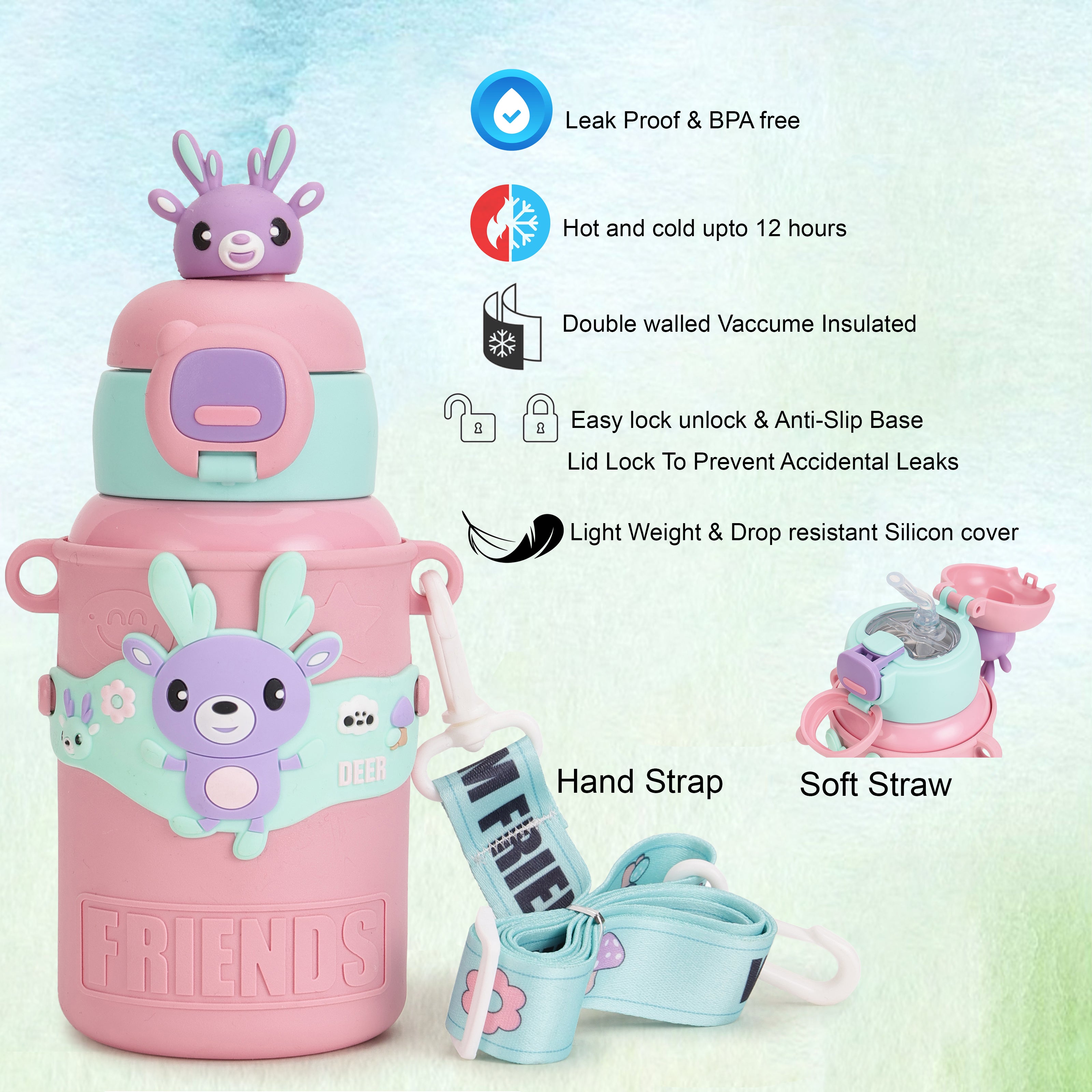 TEMPERATURE CONTROL: With advanced double-wall vacuum insulation, this water bottle keeps drinks cool for up to 8 hours and warm for up to 12 hours. Perfect for every season, kids can enjoy a refreshing cold drink in summer or a cozy hot beverage in winter. This feature ensures that drinks stay fresh and enjoyable throughout the day. LEAK-PROOF DESIGN: Featuring a secure, leak-proof lid and a sturdy straw, this steel sipper bottle for kids is designed to prevent spills and keep backpacks and bags dry. The dependable seal and easy-to-use straw make it the perfect companion for school, sports, or any adventure, giving parents peace of mind and kids a mess-free experience. PREMIUM STAINLESS STEEL 316: Crafted from high-grade Stainless Steel 316, this product guarantees superior durability and exceptional resistance to rust and corrosion. Known for its robust performance, Stainless Steel 316 is ideal for both everyday use and demanding environments such as humid or marine settings, where standard materials may falter. KID-FRIENDLY SIZE: Compact, lightweight, and easy to carry, this kids water bottle for girls 450ml is perfectly sized for small hands and fits comfortably in lunch bags and backpacks. Encouraging kids to stay hydrated independently, its size makes it easy for little ones to carry on their own. EASY TO CLEAN: This stainless steel water bottle for kids school with a wide mouth for quick refills and easy cleaning, parents can add ice cubes, fruits, or powdered mixes without hassle. This user-friendly design keeps maintenance simple, ensuring freshness and hygiene with every use."
