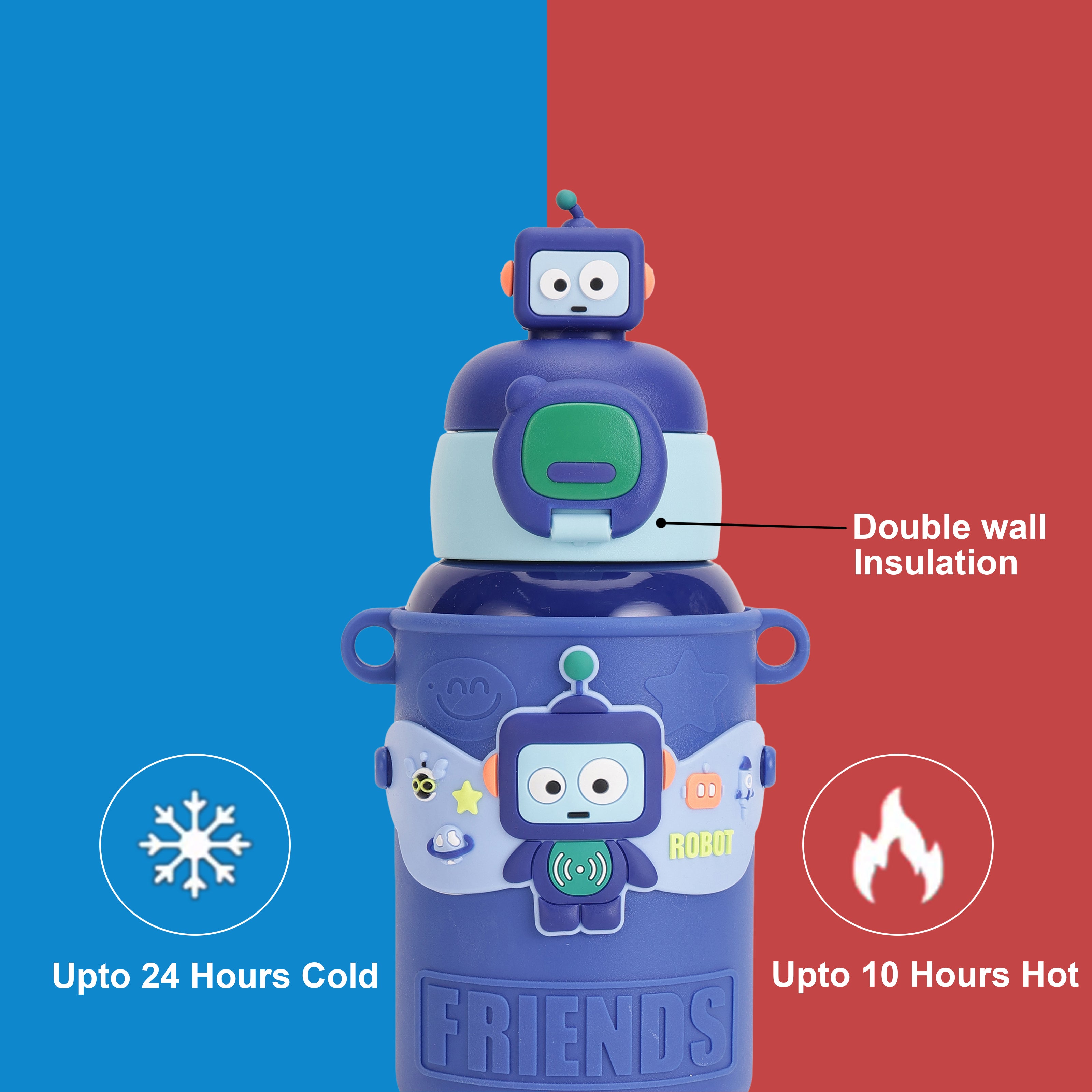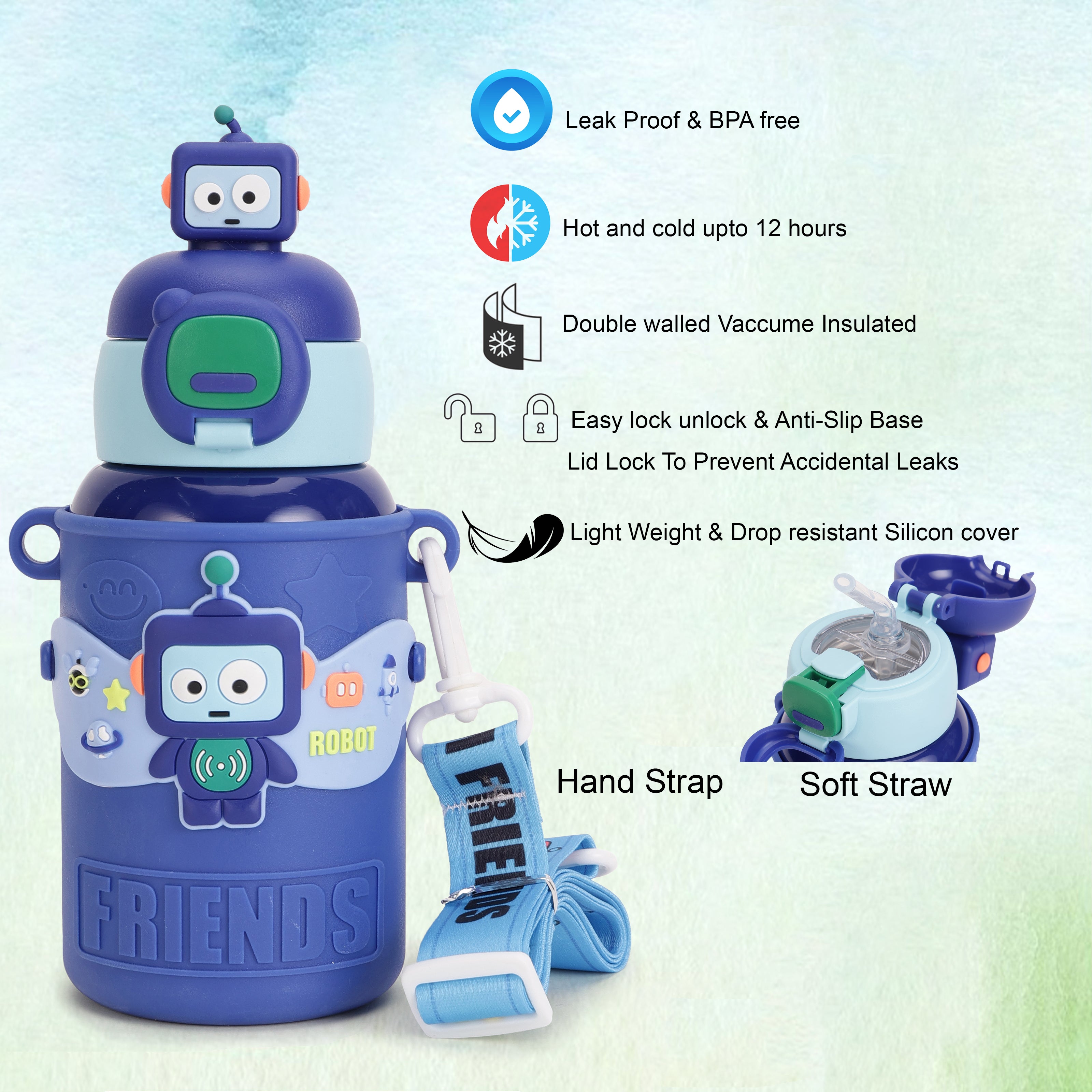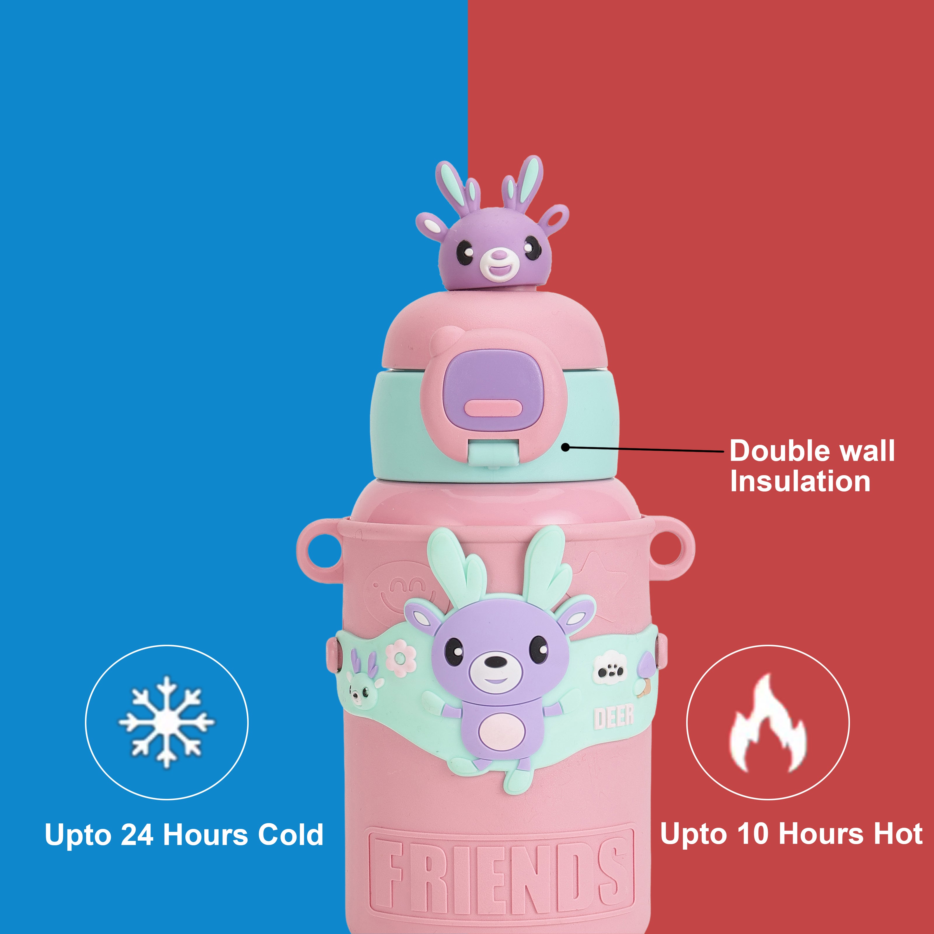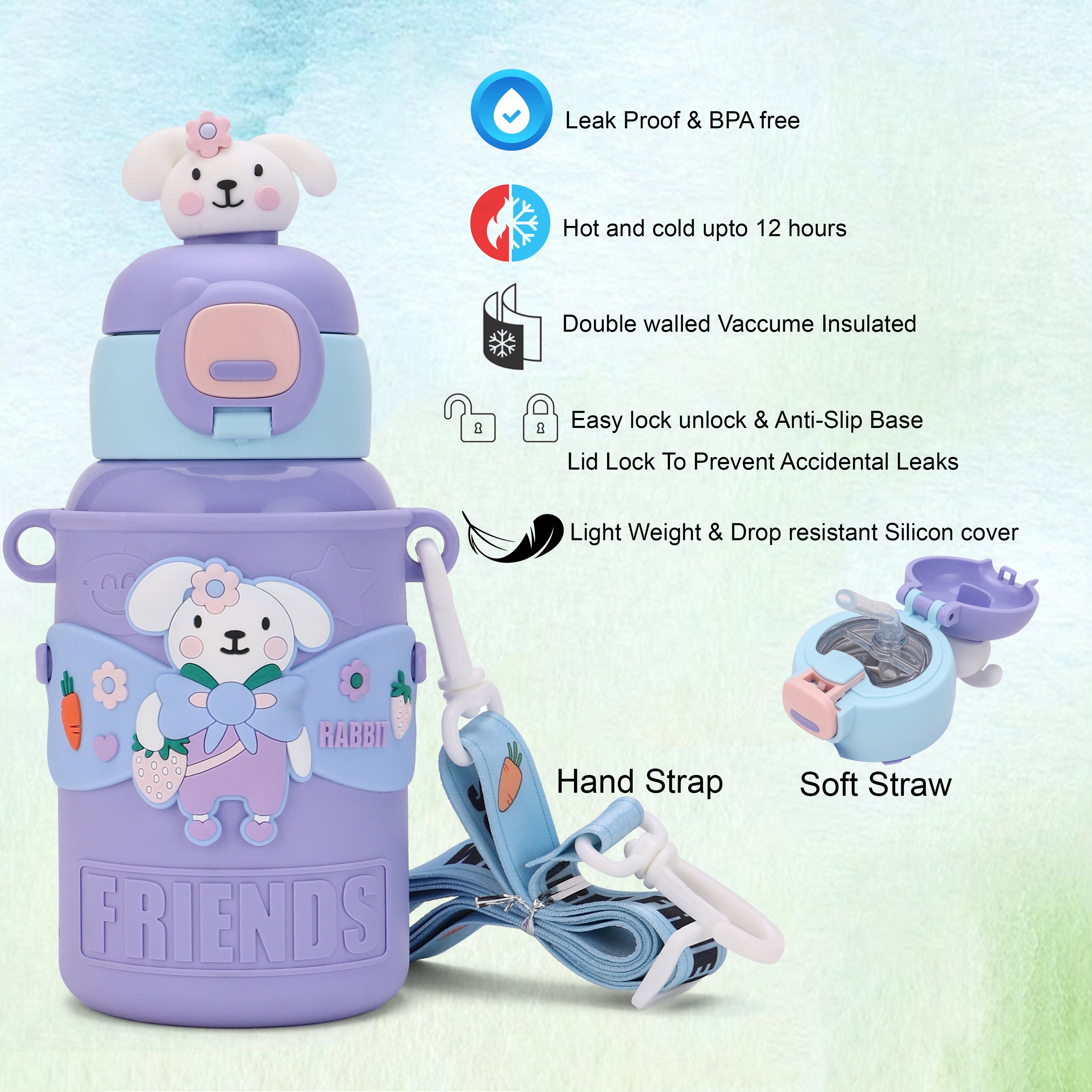 TEMPERATURE CONTROL: With advanced double-wall vacuum insulation, this water bottle keeps drinks cool for up to 8 hours and warm for up to 12 hours. Perfect for every season, kids can enjoy a refreshing cold drink in summer or a cozy hot beverage in winter. This feature ensures that drinks stay fresh and enjoyable throughout the day. LEAK-PROOF DESIGN: Featuring a secure, leak-proof lid and a sturdy straw, this steel sipper bottle for kids is designed to prevent spills and keep backpacks and bags dry. The dependable seal and easy-to-use straw make it the perfect companion for school, sports, or any adventure, giving parents peace of mind and kids a mess-free experience. PREMIUM STAINLESS STEEL 316: Crafted from high-grade Stainless Steel 316, this product guarantees superior durability and exceptional resistance to rust and corrosion. Known for its robust performance, Stainless Steel 316 is ideal for both everyday use and demanding environments such as humid or marine settings, where standard materials may falter. KID-FRIENDLY SIZE: Compact, lightweight, and easy to carry, this kids water bottle for girls 450ml is perfectly sized for small hands and fits comfortably in lunch bags and backpacks. Encouraging kids to stay hydrated independently, its size makes it easy for little ones to carry on their own. EASY TO CLEAN: This stainless steel water bottle for kids school with a wide mouth for quick refills and easy cleaning, parents can add ice cubes, fruits, or powdered mixes without hassle. This user-friendly design keeps maintenance simple, ensuring freshness and hygiene with every use."